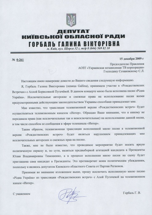 Требование певицы Галлины (экс-супруги регионала Василия Горбаля) вырезать ее участие в шоу «Рождественские встречи» Пугачевой из новогоднего эфира «Интера», пожалуй, прецедент. В том смысле, что артисты в очередь выстраиваются, чтобы добиться благосклонности Примадонны, а Галлина своими руками «подписывает приговор». Причина столь необычного заявления певицы в том, что она не хочет, чтобы украинцы увидели ее рядом с Юлией Тимошенко, которая вышла на сцену, когда Галлина исполняла песню «Рідна мова». По словам артистки, это может быть расценено как агитация за Леди Ю., при том, что она всецело поддерживает регионалов и сама - депутат Киевского облсовета от Партии Регионов. Более того, по словам Галлины, она не знала «что меро¬приятие будет носить яркую политическую окраску и, по сути, будет агитацией за кандидата в президенты Юлию Тимошенко...». Именно по этой причине она просит исключить свой номер из трансляции «Встреч» на «Интере».