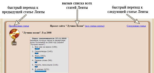 Сайт Алла-Суперстар продолжает развиваться. Сегодня мы добавили еще одну функцию: «Новостную ленту». Вот вы, например, читаете пост о проекте «Лучшие песни 2007 года». Понятно, что ранее был пост о 2008 и 2009 годах. А как найти эти посты? Раньше приходилось заходить в архив новостей и тупо листать страницы. Теперь новости будут объединяться в логические цепочки. Т.е. находясь, к примеру, на странице «Лучшие песни 2007 года» вы можете перейти на предыдущую статью, последующую или же любую статью из ленты. Надеемся, что нововведение окажется полезным.