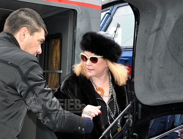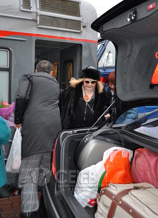 Приехала АБ не изменяя своим прежним традициям. В фирменном сером вагончике. На перроне встречали Пугачеву, как и в прошлый раз, преданная подруга Валентина Басовская и пара тройка фанатов. Сначала из вагона выгрузили целую охапку костюмов в кофрах. А чуть позже появилась в гордом одиночестве и сама Пугачева. Ведь рыцарь ее сердца Максим Галкин сейчас находится на гастролях в Германии. Вышла из вагона АБ в черной короткой норковой шубке молодежного фасона, в черной меховой шапочке и темных очках. Увидев, что ее фотографируют папарацци, она по-царски изрекла: