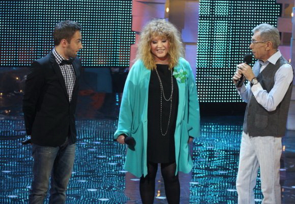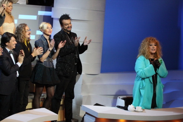 - Здесь и сейчас в шоу «ДОстояние РЕспублики», - продолжает Николаев. - Примадонна нашей эстрады, композитор Алла Борисовна Пугачева. (После этих слов Николаева звучит музыка, под которую и должна выходить певица.)